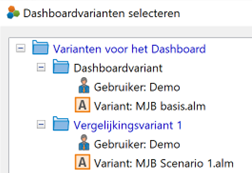 De dashboardvariant wordt gezien als de basis van de meerjarenbegroting. De vergelijkingsvariant wordt gebruikt om te kijken wat de impact is van een ander scenario op de begroting. In de gratis basisversie van het Dashboard kan je een dashboardvariant en één vergelijkingsvariant koppelen. Zie afbeelding hieronder.
