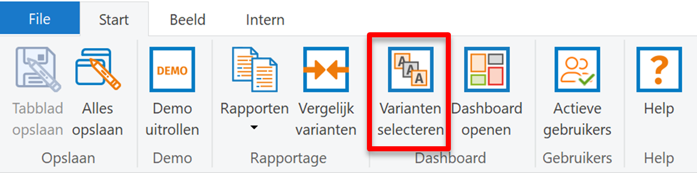 De WALS-gebruiker geeft in WALS aan welke varianten in het dashboard worden getoond. Dit doet de WALS-gebruiker via de knop ‘Varianten selecteren’. We maken hierbij onderscheid tussen de dashboardvariant, en één of meerdere vergelijkingsvarianten.