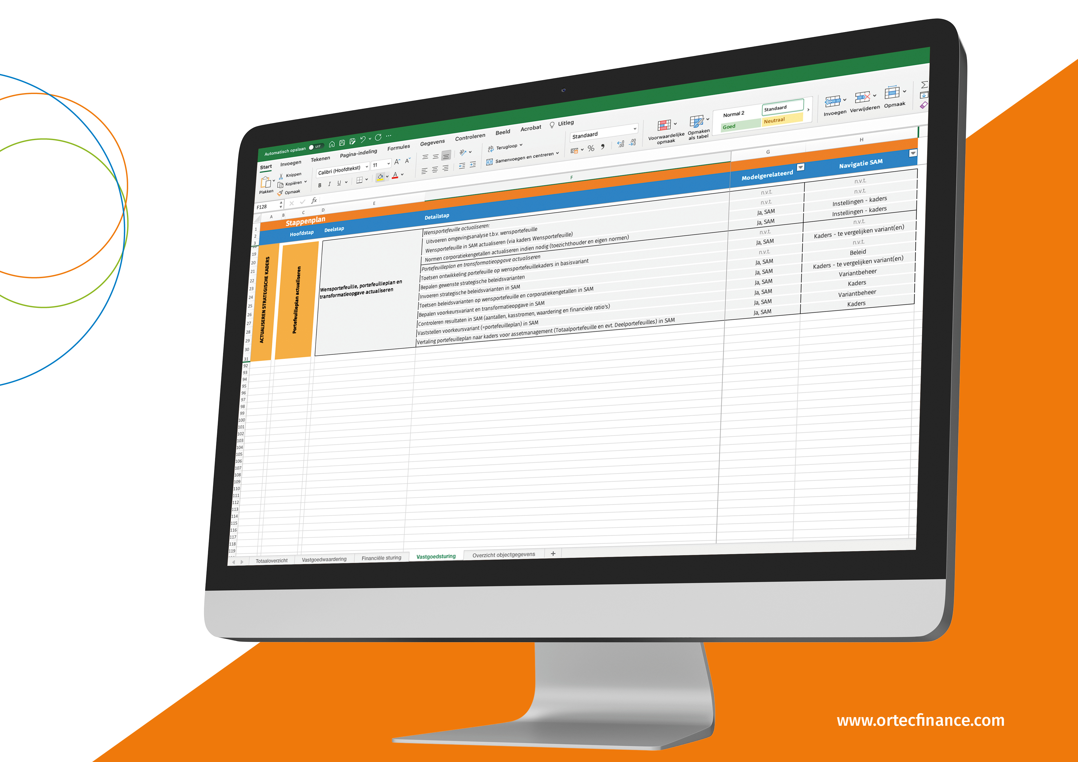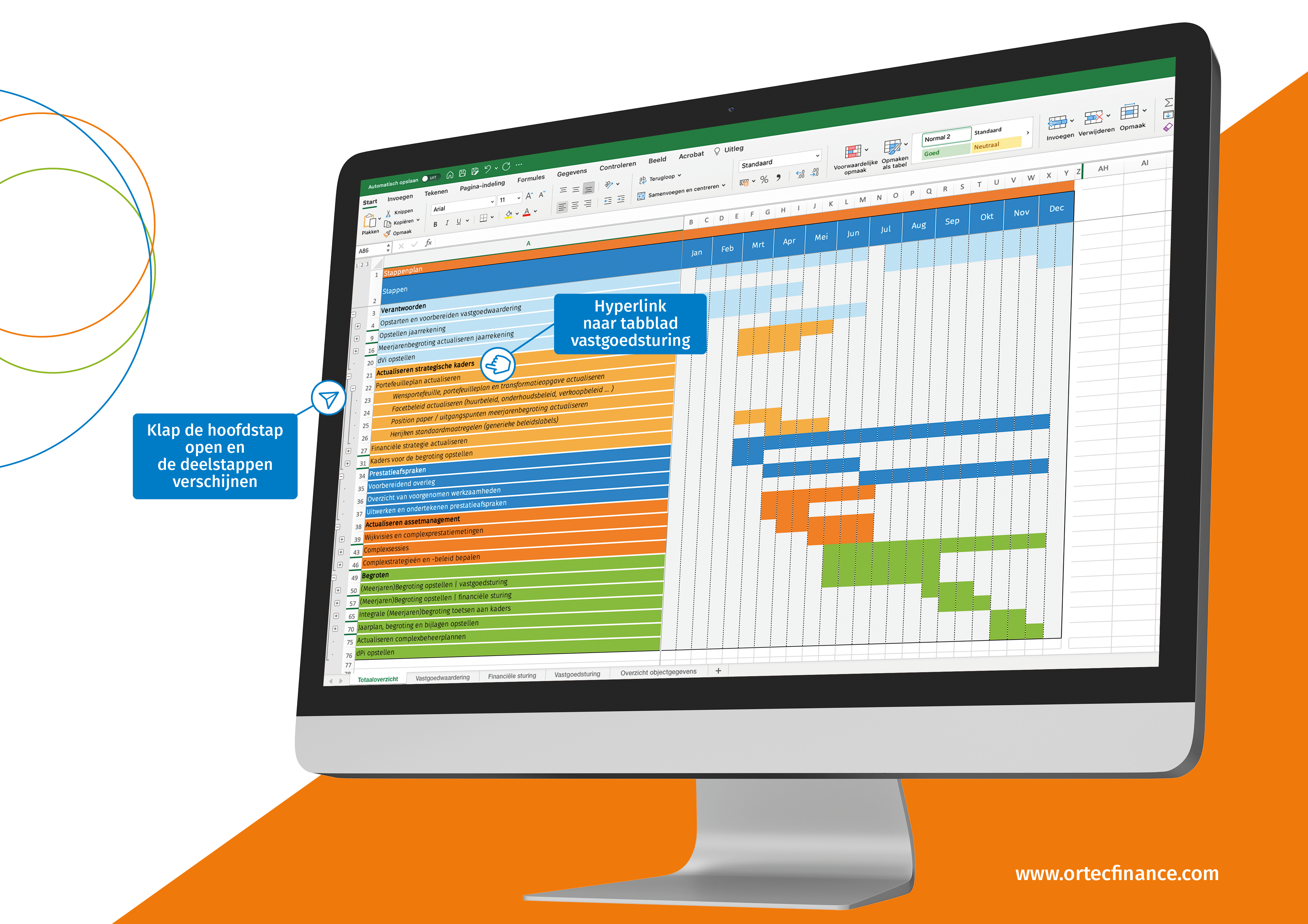 Het totaaloverzicht van de jaarcyclus kan je verder openklappen tot het niveau van de deelstappen. Via hyperlinks kan je snel doorklikken naar de details op een van de drie tabbladen vastgoedwaardering, financiële sturing of vastgoedsturing.