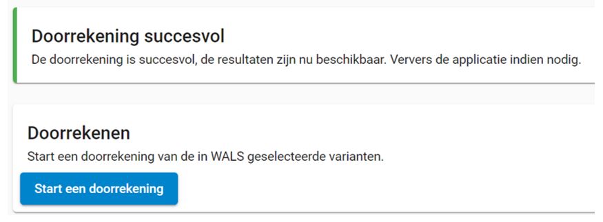 Wanneer de juiste varianten in WALS geselecteerd staan, kun je gaan doorrekenen. Om de variant on-demand door te rekenen in het WALS Dashboard, navigeer je naar ‘Doorrekenen’ links in het menu. Klik vervolgens op ‘Start een doorrekening’. Wanneer de doorrekening gelukt is, zal er een melding tevoorschijn komen dat de doorrekening succesvol gelukt is. Hierna zijn de resultaten per direct te zien.